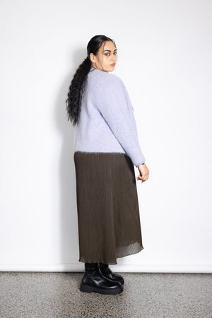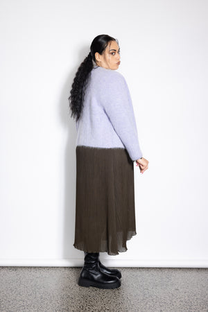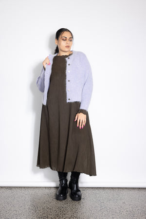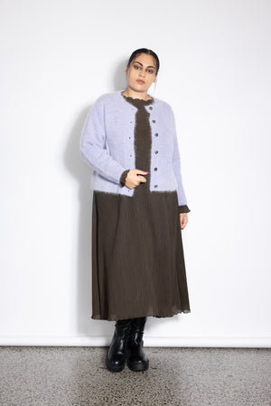 I have not taken this cardi off for a week! It is so soft, light, and cozy, and it goes with everything! The Dani Cardi is a very cute, fuzzy button-up cardi with shell buttons that hits at the waist without being too cropped. We have designed it with the shoulder sitting up where it should to create a nice line, and the stretch in the rib means you can push up the sleeve if you like. The angora blend hardly sheds and really holds its shape, so it looks fresh after repeated wear.