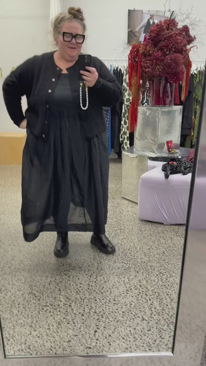 Outfit details | Ella is 176cm tall and wears a size M/L Dani Cardi in Ink with a Freddie Layering Top in Squiggle Print and Black Cargo Pants.