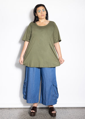 This cotton tee shirt has it all. A subtle A-line shape, pockets, nice shoulder line and scoop neck.