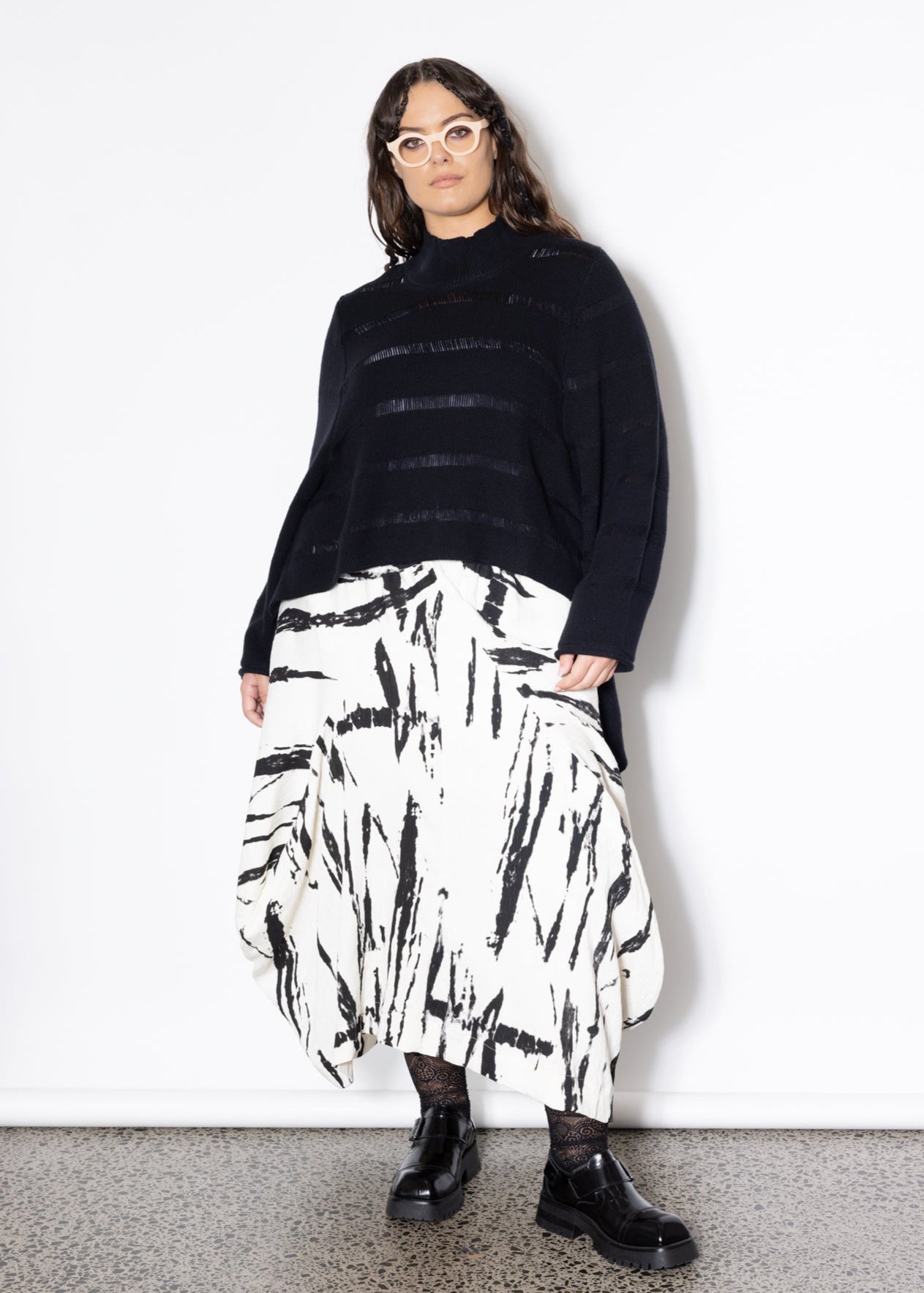 This is such a cool skirt - we played with some draping to give it an edgy feel but because it has an elastic waist its super comfy. Layered up with some of our knitwear and some cozy leggings and boots, this is such a great look for winter.