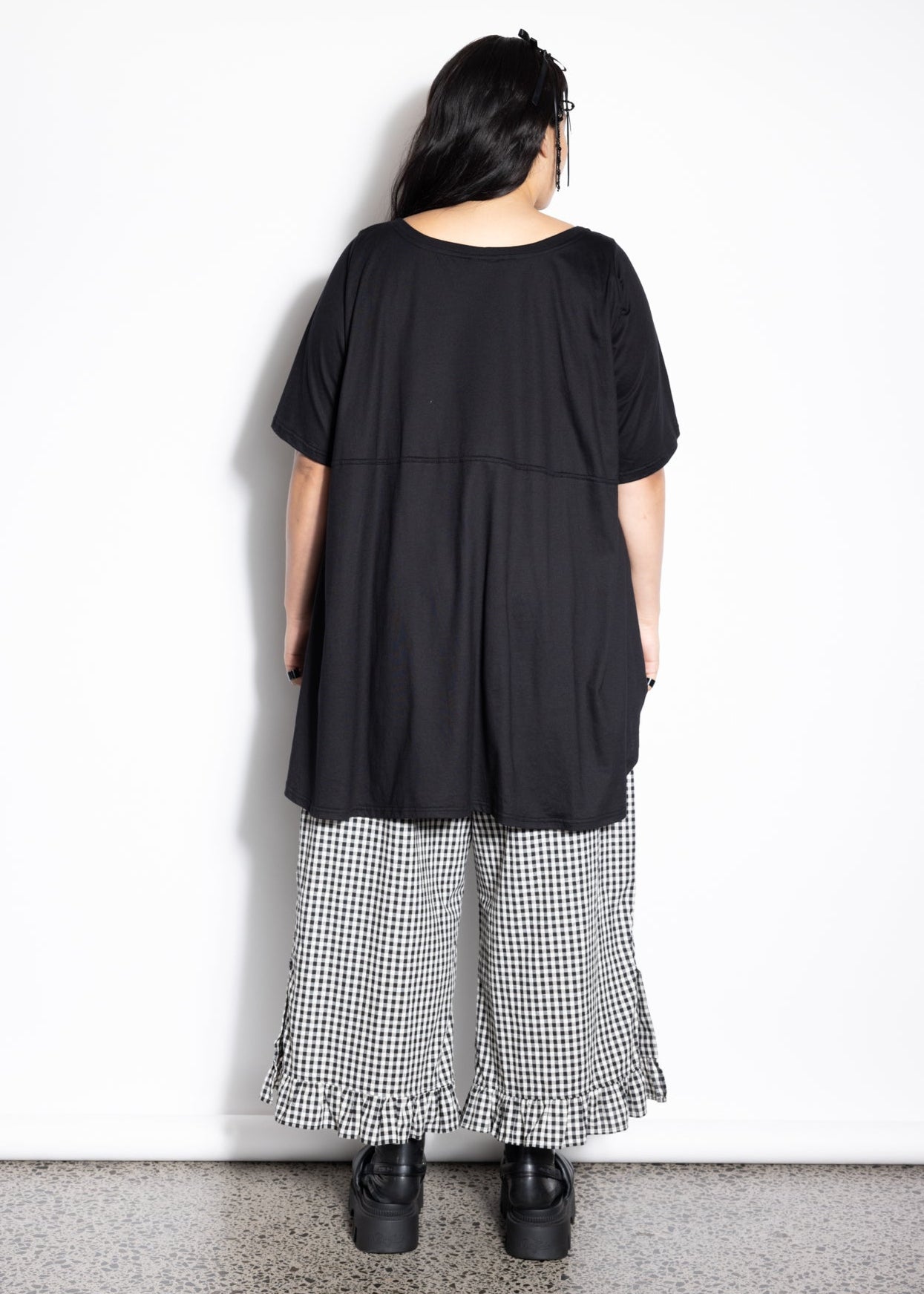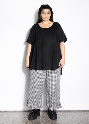 Outfit details | Ellen wears a size L 501 Tee in Black with Gingham Frill Pants in Size L.