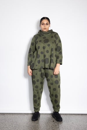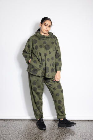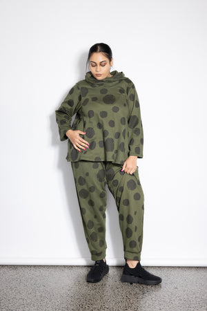 Outfit details |Model wears Swing Hoodie Khaki Spot with Spot Trackies. Last photo with Khaki Spot Sculpture Coat.