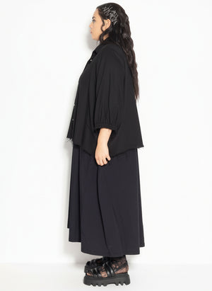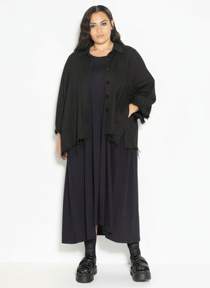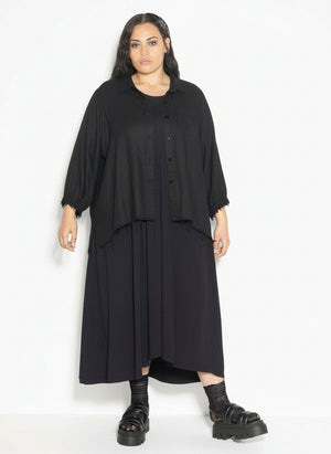 We made a new shirt! This little cutie is perfect to throw on like a wee casual jacket on a summer evening or as a shorter length top. We kept the hems raw to add a bit of LALA edge and the cool factor. Works back with pants and skirts very well because of the shorter length. The fabric is nice and light with a good drape and as always we favour a washed finished.