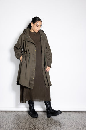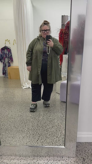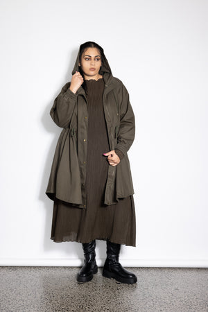 Details| hood, drawing string waist and hem, dome and zip closure, pockets, storm flap.