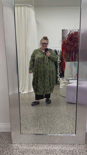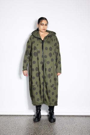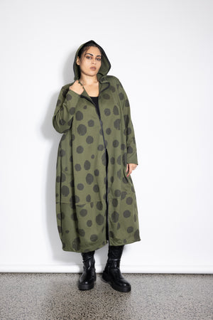 We have made this very popular coat a little bit longer and in a cozy, casual sweatshirt version. Loving the tonal spots for a bit of fun!
