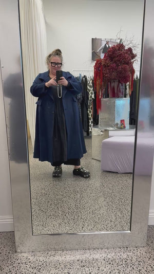 Ella wears a the size XL coat with our Lounge Suit (coming soon in ink).