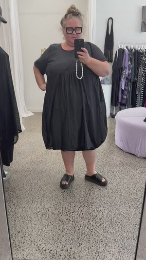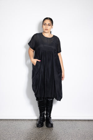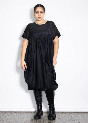 A classic LaLA cut with a slight update - We decided to enhance the original Macy Dress. The new version is longer than the original and has updated details of gathering through the back. The set insleeve and the barrel cut hem look so great on, and the new 120cm length works so well for different heights.