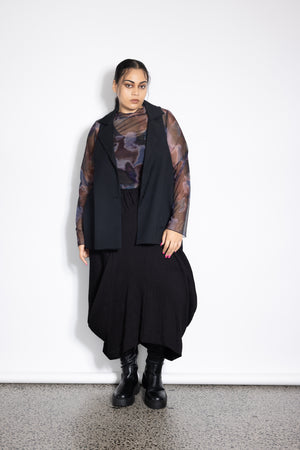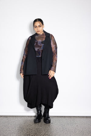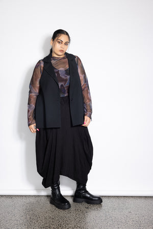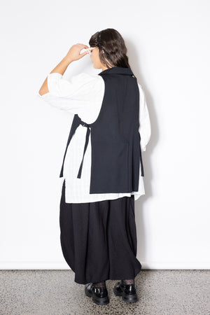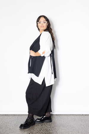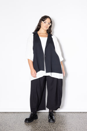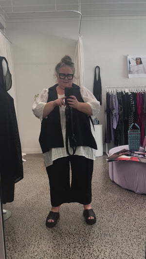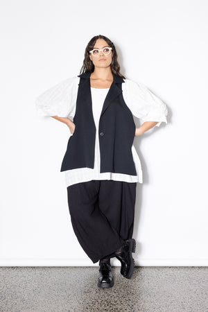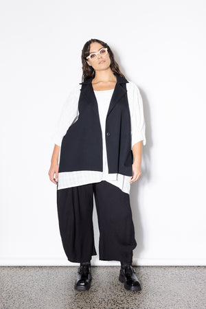 Outfit details | Ella wears a size M/L Lynne Waistcoat with a White Palm Tee and Black Pleat Curve Pant (Coming Soon).