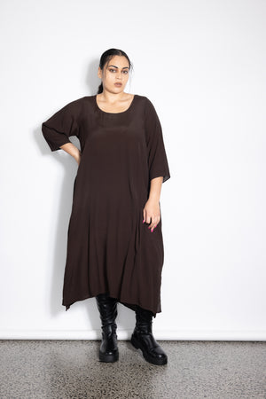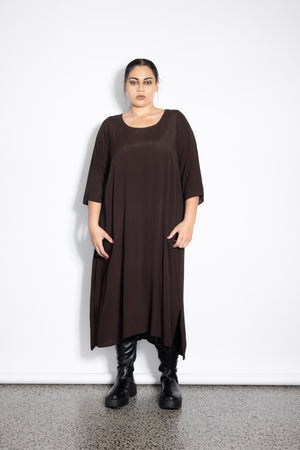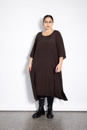 We have made a deceptively simple dress with a 3/4 sleeve which we are sure you will reach for on repeat. The A-Line shape works for so many bodies with out being bulky. The magic of this dress is really in the Crepe De Chine fabric that grows (just a wee bit) as you wear it and moulds to your body with that bit of give which makes it so comfy. Wear it on its own, as a layering piece or even a nighty! A no brainer for winter and in this seasons key colours.