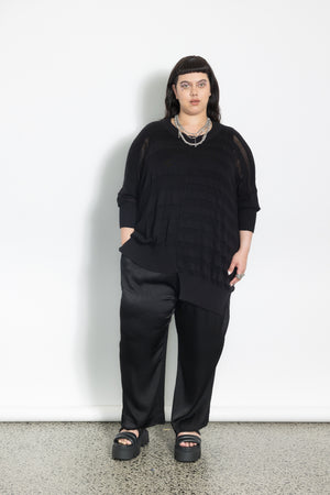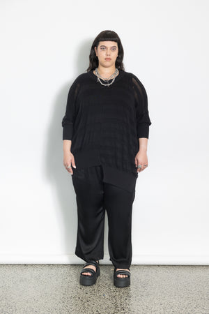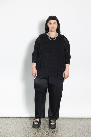 Featuring an asymmetric twist of the stripes being different sizes and the ribs on the hem are different lengths.