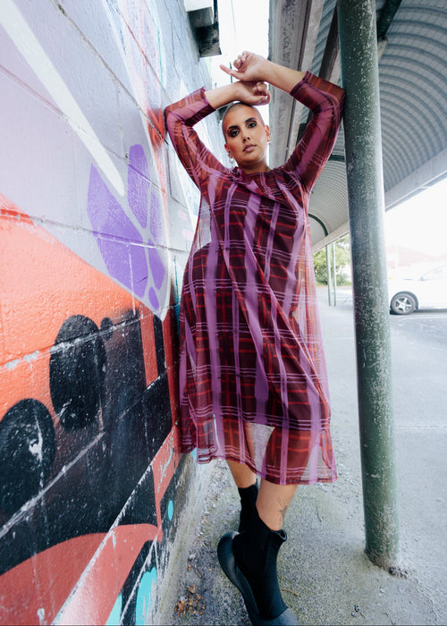 This is our exclusive LaLA print for this season, a relaxed check in deep sea blues and greens.  We have put it in our popular mesh dress.  It is not fitted through the body, and instead has a gentle A line.  It is so fun to layer this piece either on top or underneath your other pieces - have a play!