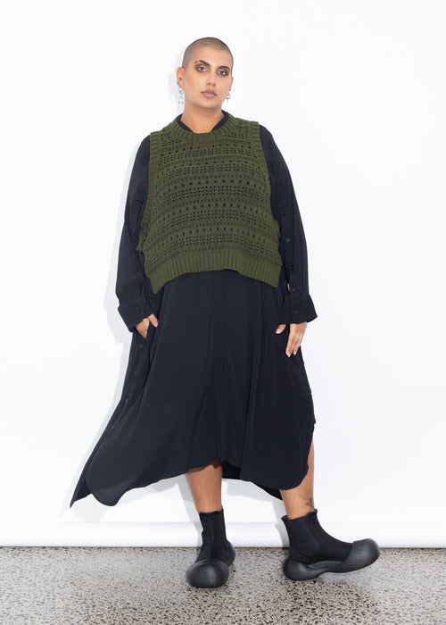 The Lani Vest gives a cool crop silhouette to whatever you choose to layer it over or wear it on its own! Being sleeveless makes it easy to fit under a coat or jacket in the cooler months.