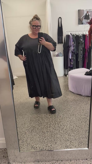 Ella wears a size L Lena dress with a Maxi Slip Black underneath.