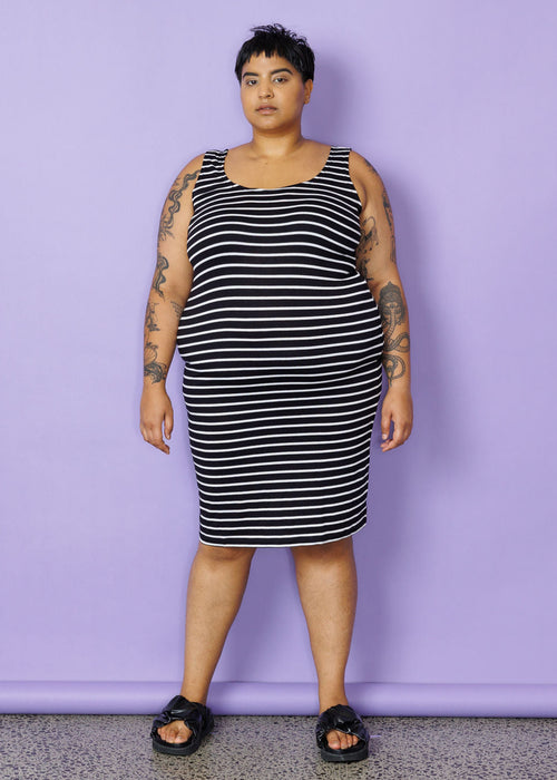 The midi knit slip -  depending on your height this slip goes to around the knee.  The knit singlet dress is so comfy and great for layering to give that lovely column silhouette. lots of stretch in the fabric.