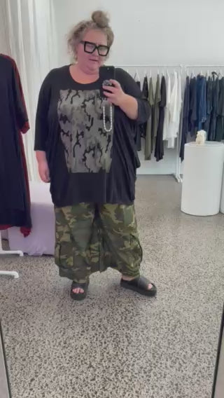 Details | Pockets, Scoop neck, Square oversized shape with 3/4 sleeve.