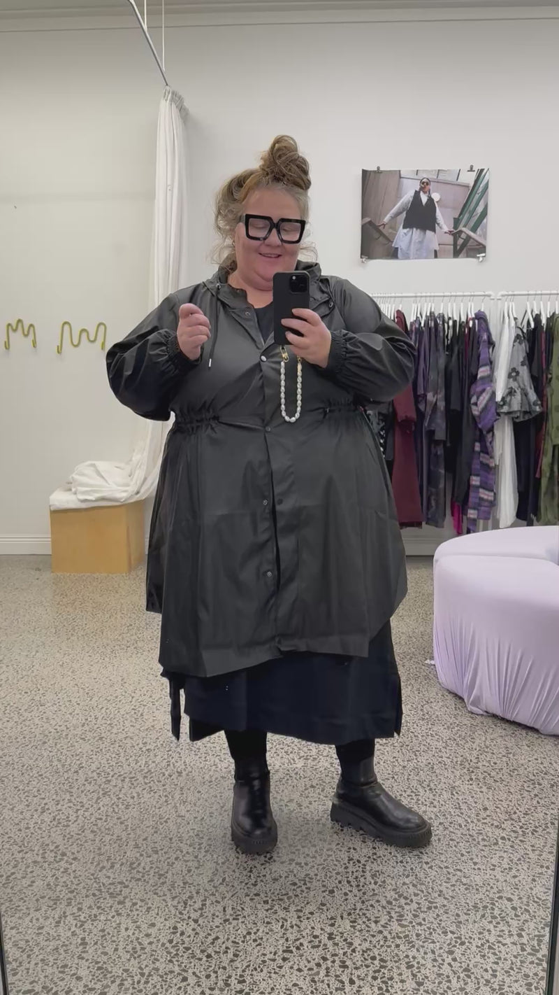 The long-awaited raincoat is stylish and functions to protect you from the rain and the wind. We took style ideas from work wear, trench coats, shirt tails and anoraks. The fit is roomy, so you can layer. The elastic adjustable casing at the waist gives a lovely texture and shape to the style. The hood looks cool and fits nicely when you get caught out in the weather. Let me know if you have any questions.